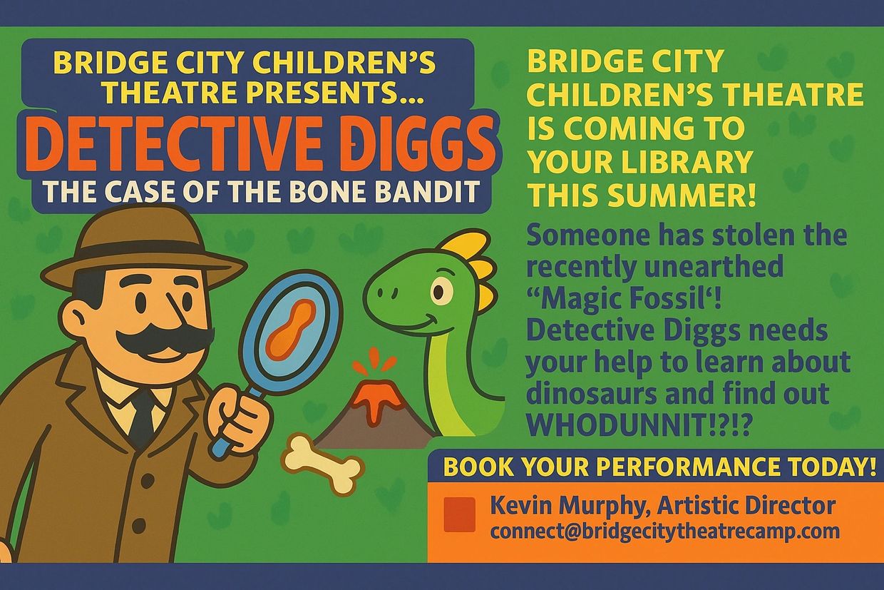 Detective Diggs and the Case of the Bone Bandit is a playful mystery where children help Detective Diggs gather clues, question suspects, and solve the case together. The performance is highly interactive, age-appropriate, and designed to work well in library spaces.